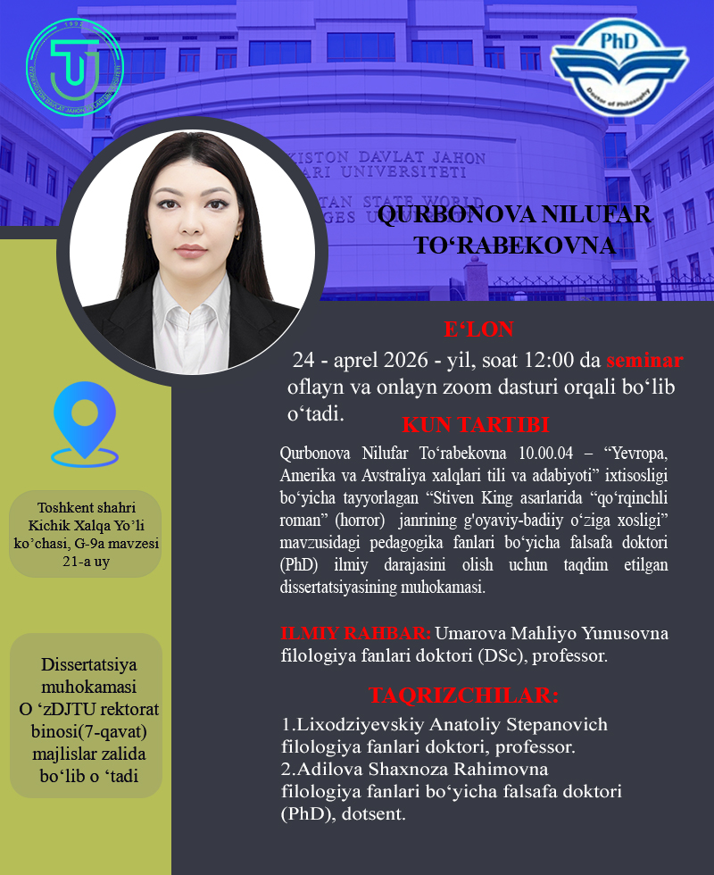 O‘zbekiston davlat jahon tillari universiteti (O‘zDJTU) 1949-yilda Toshkent chet tillari pedagogika instituti nomi bilan faoliyatini boshlagan. Universitet 70 yillik tarixga ega. 1992-yili Toshkent chet tillari pedagogika instituti hamda Respublika Rus tili va adabiyoti instituti birlashib, O‘zbekiston davlat jahon tillari universiteti maqomiga ega bo‘ldi.
