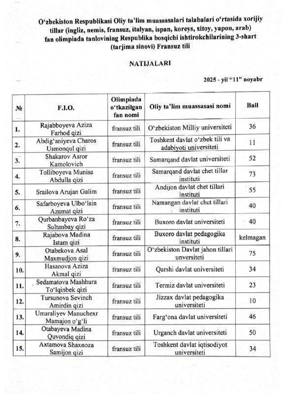 乌兹别克斯坦共和国高等院校学生外语奥林匹克竞赛共和国阶段法语项目第三轮(翻译测试)成绩