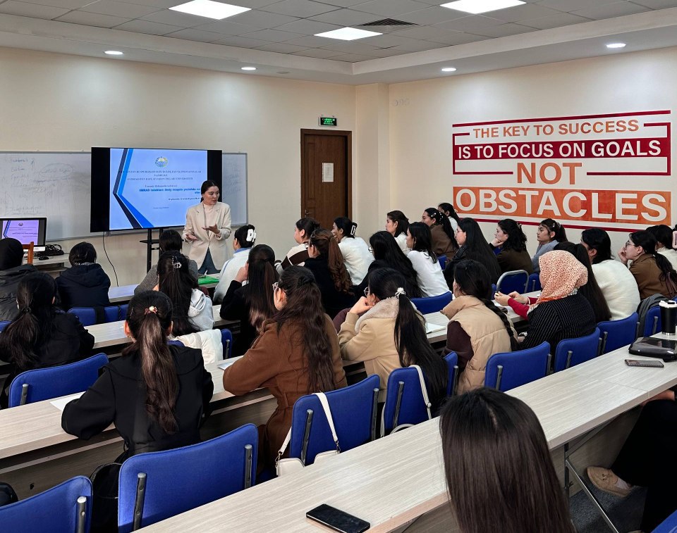祖尔菲亚奖获得者、社团负责人Rohilabonu G'ochchiyeva为学生组织了关于选择科研主题和撰写学术论文阶段的学习研讨会。