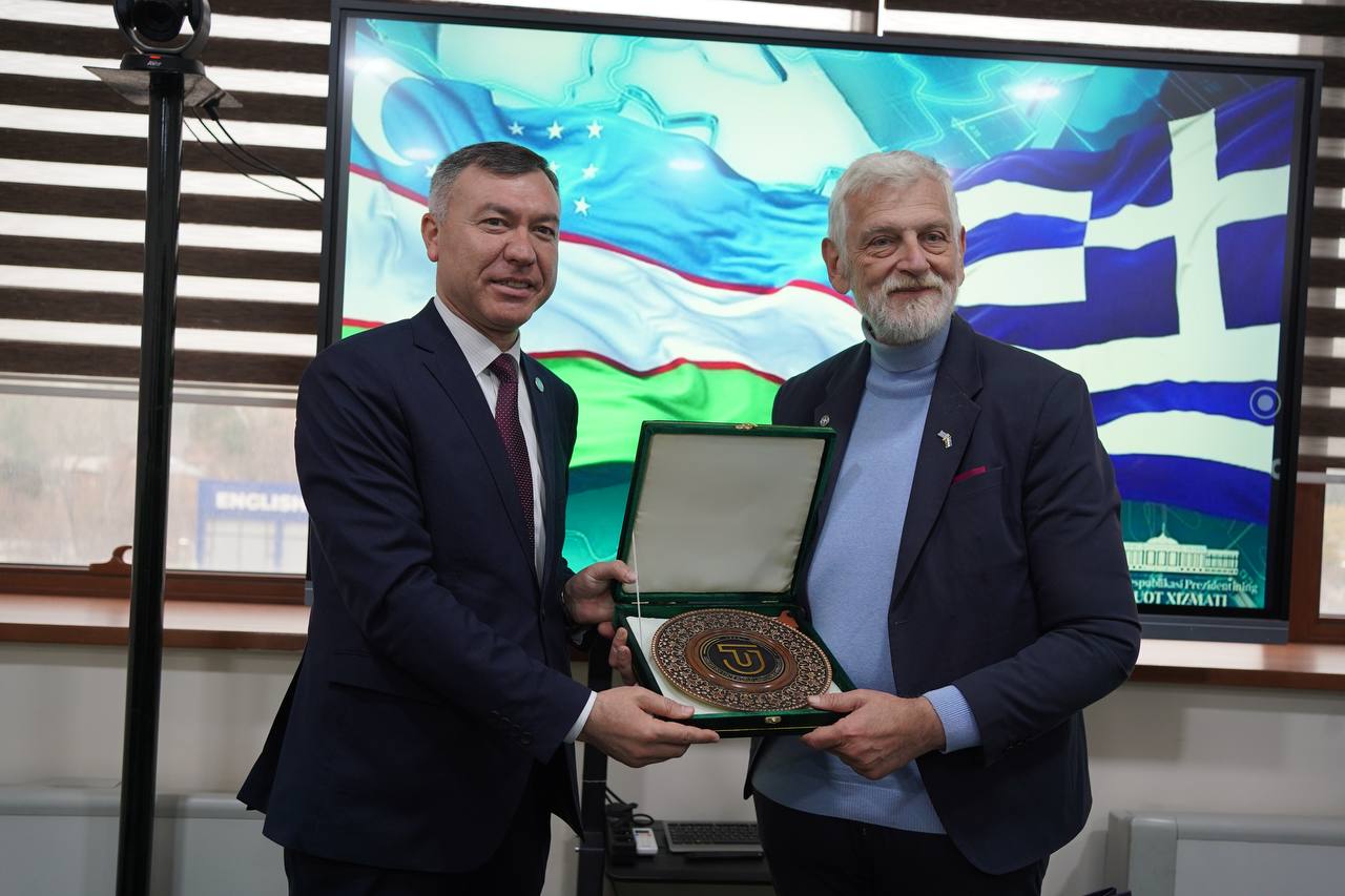 The meeting was attended by the University Rector I. Tukhtasinov, Vice-Rector for International Cooperation A. Nasirov, Head of the International Relations Department Kh. Yuldashev, and Greek language instructor S. Musaeva.