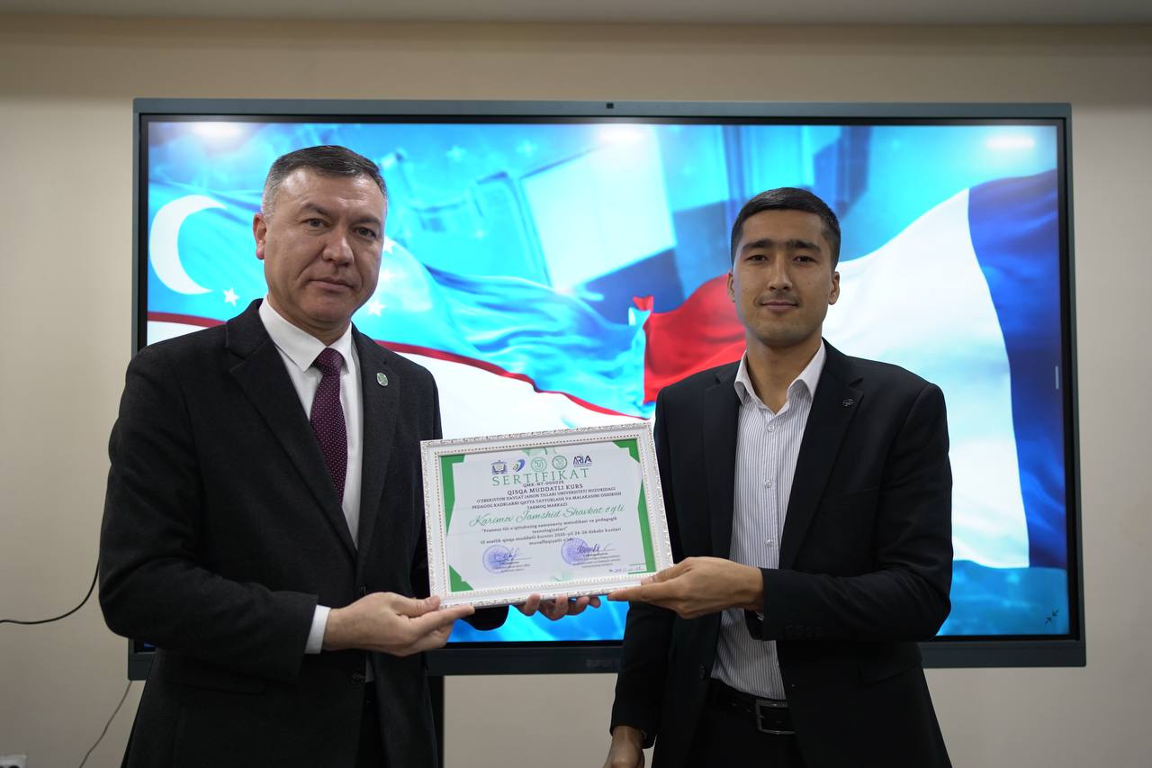 The university rector, Professor I. Tuxtasinov, attended the certificate awarding ceremony and warmly congratulated the teachers on successfully completing the course. In his speech, he emphasized the importance of this short-term course for improving the quality of French language instruction, developing teachers’ professional competencies, and preparing staff in line with international educational standards.