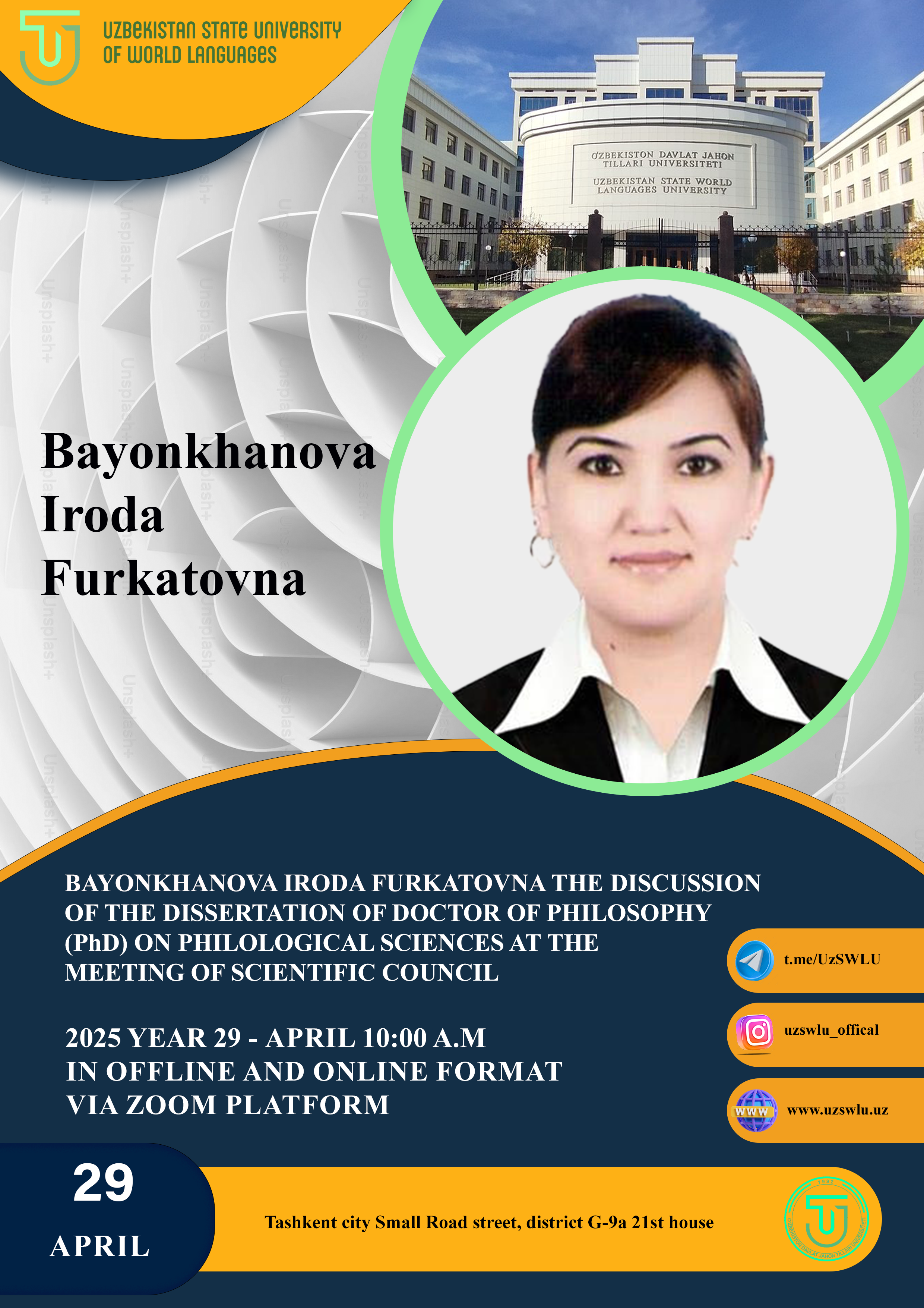 Extended meeting of Departments for discussing doctoral dissertation by Bayonkhanova Iroda Furkatovna presented for obtaining the degree of Doctor of Philosophy (PhD) in the specialty 10.00.06 – Comparative literary studies, Comparative linguistics and Translation studies on the topic "Discursive and pragmatic characteristics of proverbs expressing the etiquette of communication (on the example of the Korean and Uzbek languages.