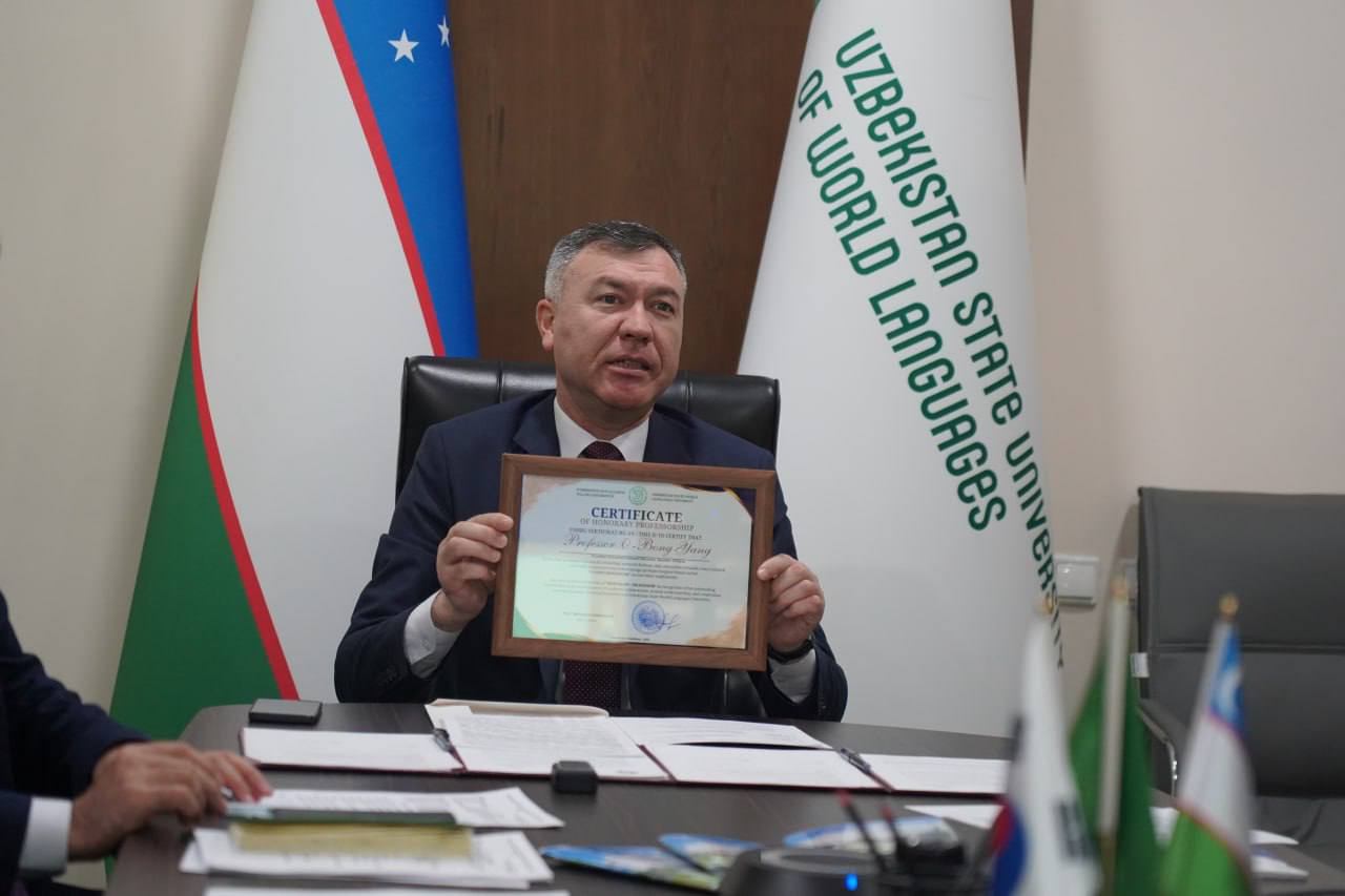 From USUWL, the participants included Rector I. Tuxtasinov, Vice-Rector for International Cooperation A. Nasirov, Vice-Rector for Scientific Research and Innovation O. Yusupov, Head of the International Cooperation Department X. Yuldashev, Dean of the Faculty of Oriental Philology D. Juraev, and Korean language lecturer I. Abdiyeva.