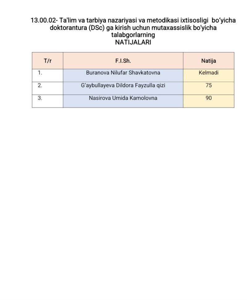 Results of Applicants for the Specialty Examination for Admission to the Doctoral Program (DSc) in 13.00.02 – Theory and Methodology of Education and Upbringing