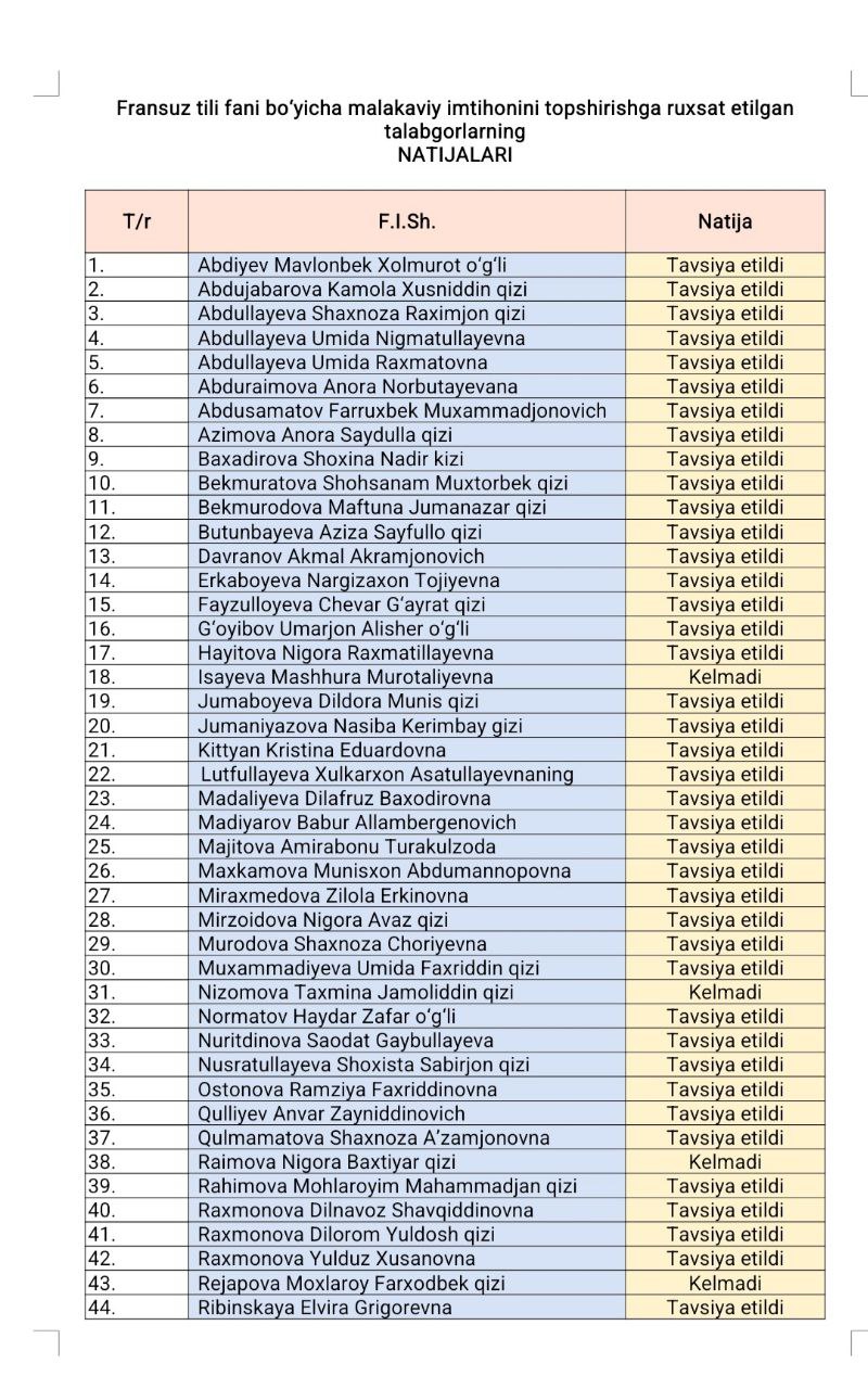 Results of Applicants Permitted to Take the French Proficiency Examination