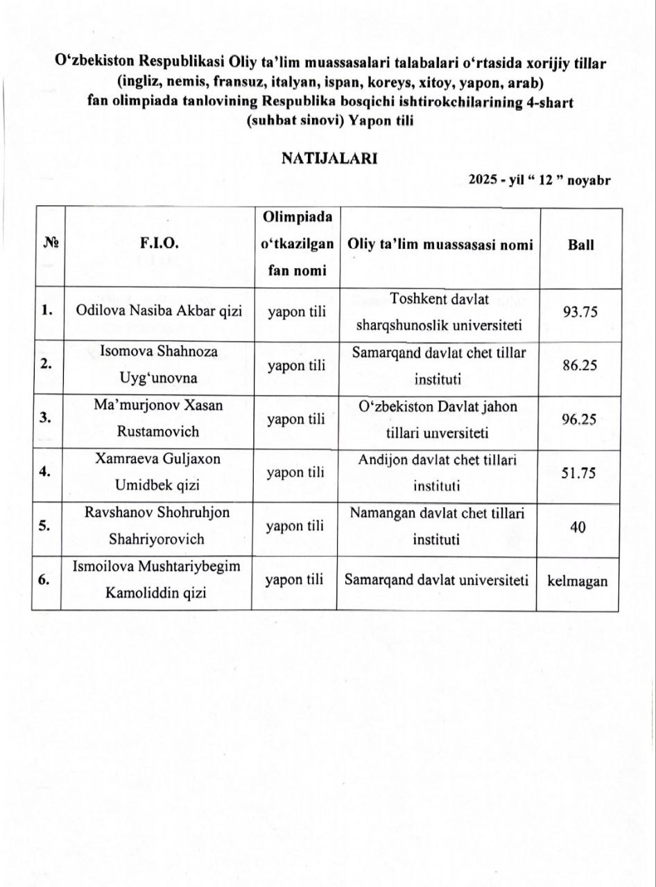 Results of the 4th stage (interview test) in the Japanese language for participants of the Republican round of the Foreign Languages Olympiad among university students of the Republic of Uzbekistan