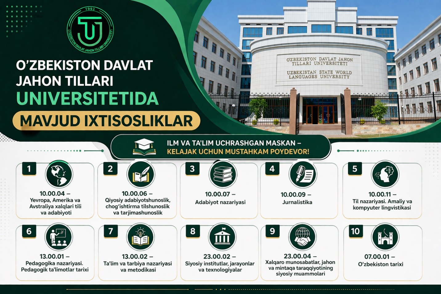 O‘zbekiston davlat jahon tillari universitetida tayanch doktorantura, doktorantura, stajor-tadqiqotchilik va mustaqil izlanuvchilikka qabul qilish bo‘yicha ma’lumot