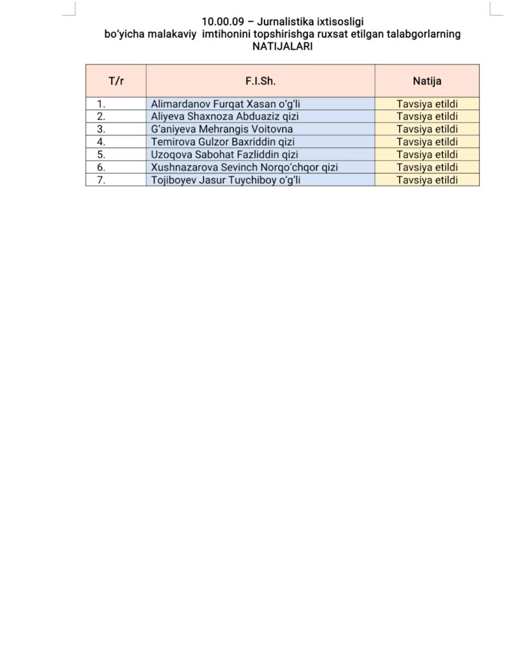10.00.09 – Jurnalistika ixtisosligi bo‘yicha malakaviy imtihonini topshirishga ruxsat etilgan talabgorlarning natijalari