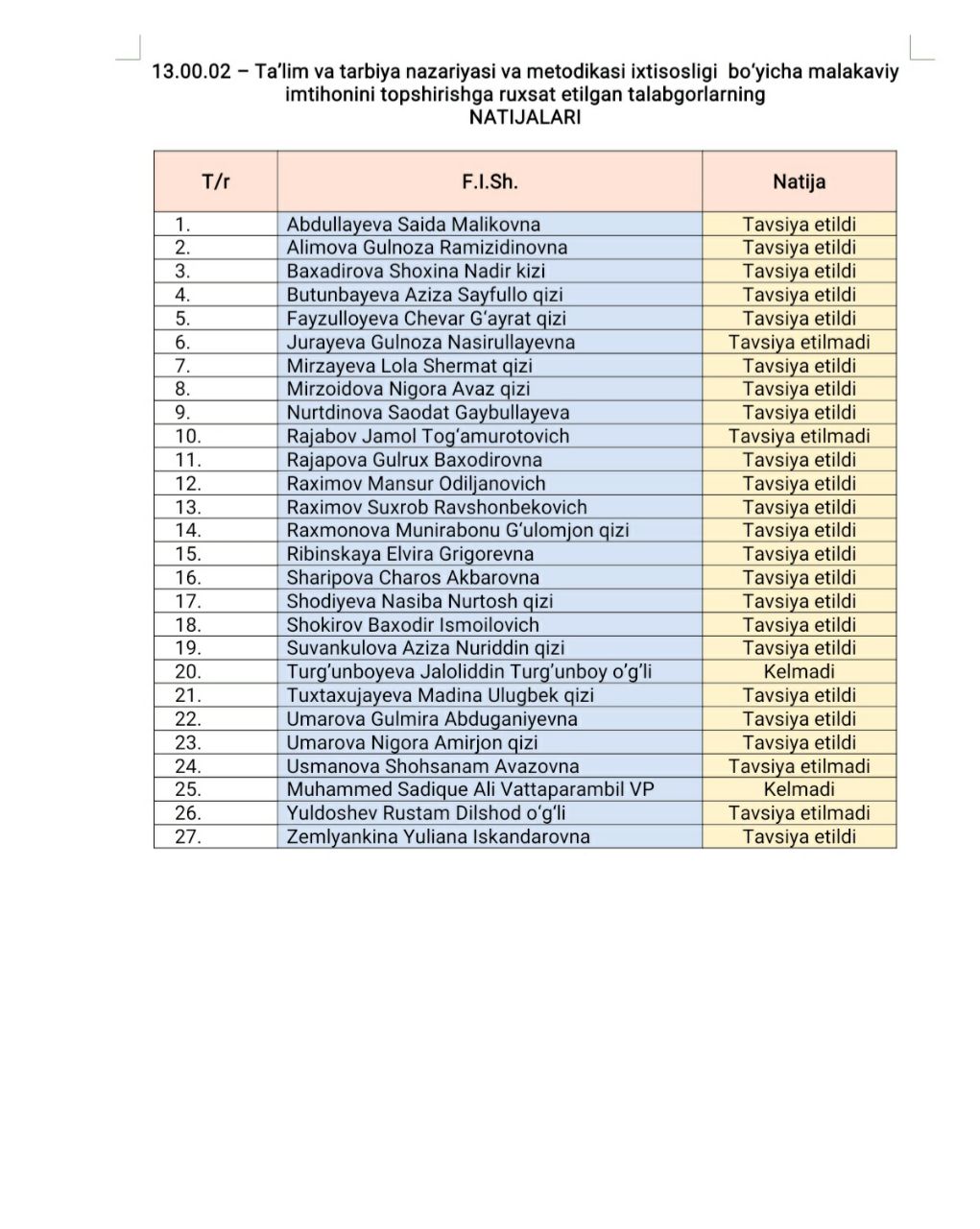 13.00.02 – Ta’lim va tarbiya nazariyasi va metodikasi ixtisosligi bo‘yicha malakaviy imtihonini topshirishga ruxsat etilgan talabgorlarning natijalari