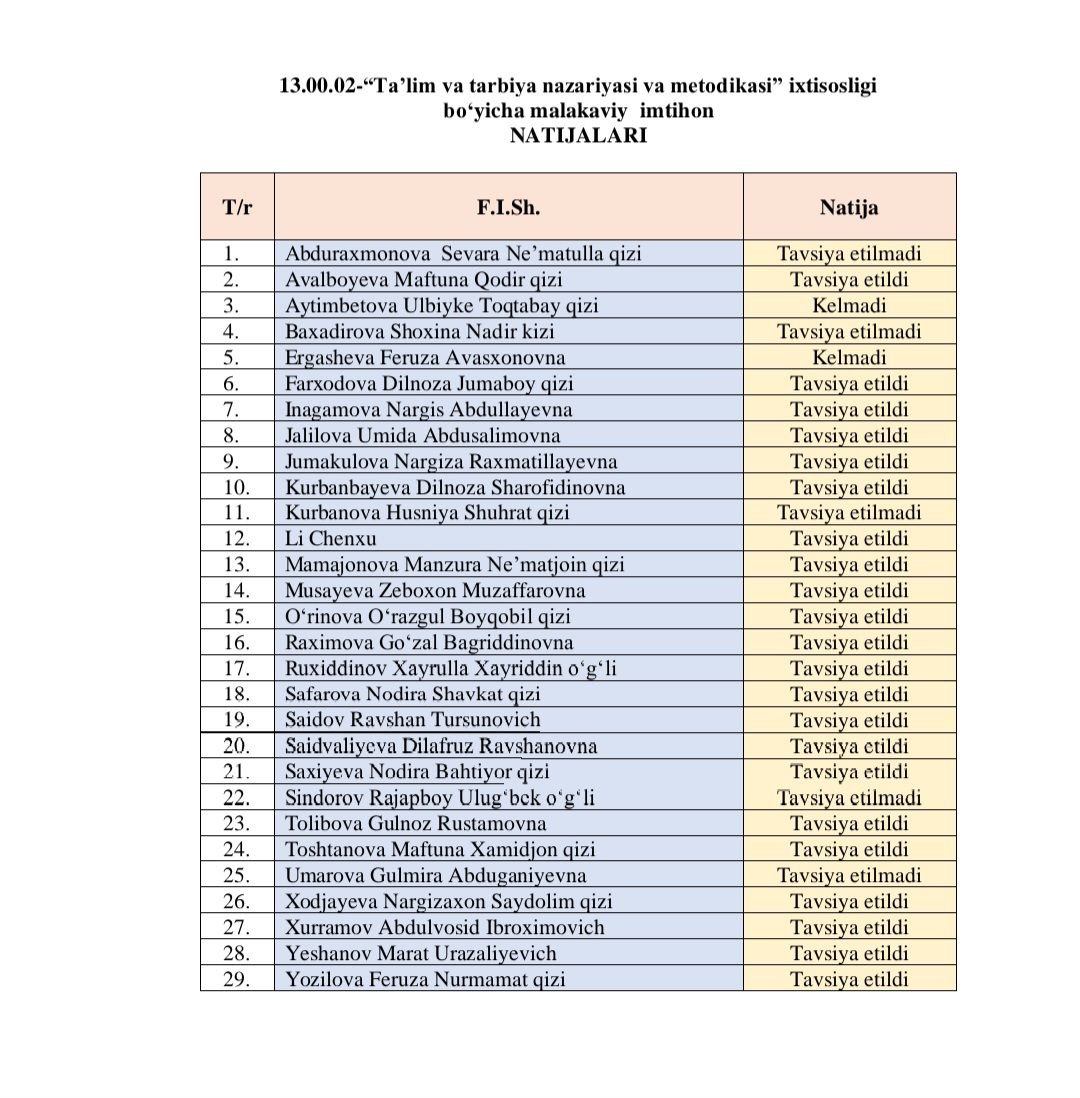 13.00.02 - Ta'lim va tarbiya nazariyasi va metodikasi ixtisosligi bo‘yicha imtihon natijalari