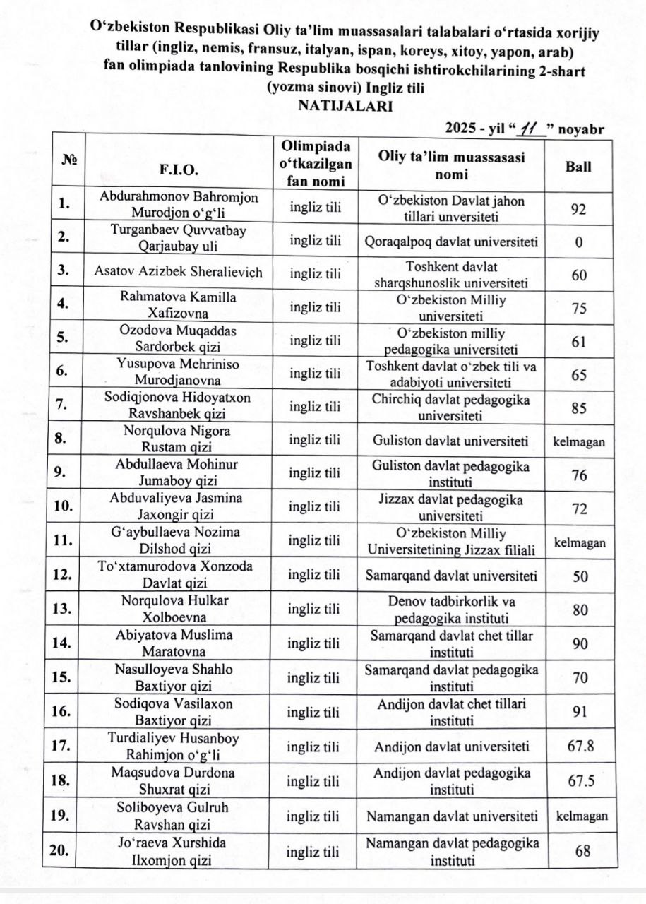 O‘zbekiston Respublikasi oliy ta’lim muassasalari talabalari o‘rtasida xorijiy tillar fan olimpiadasi tanlovining Respublika bosqichi ishtirokchilarining 2-shart (yozma sinovi) ingliz tili natijalari