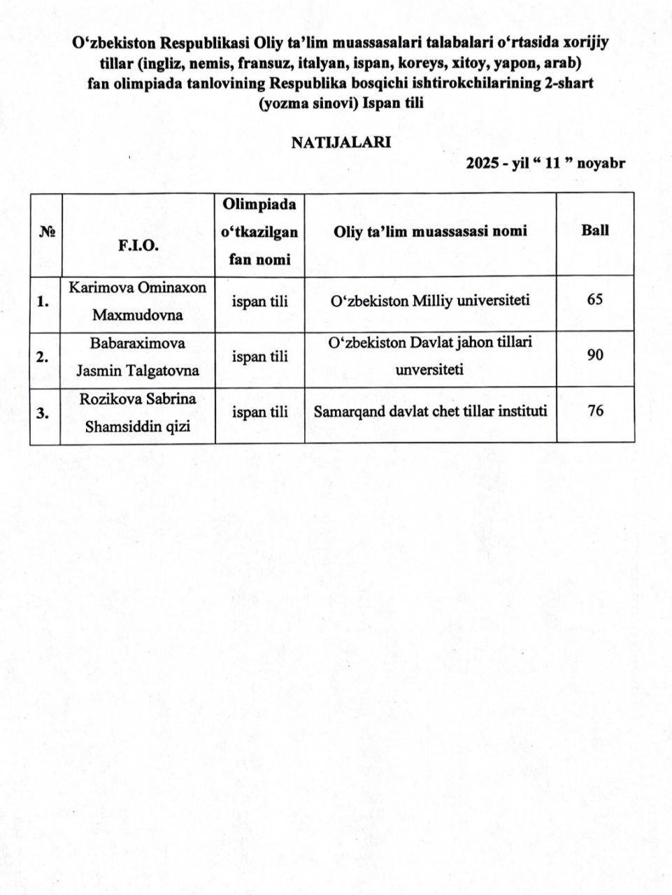 O‘zbekiston Respublikasi oliy ta’lim muassasalari talabalari o‘rtasida xorijiy tillar fan olimpiadasi tanlovining Respublika bosqichi ishtirokchilarining 2-shart (yozma sinovi) ispan tili natijalari
