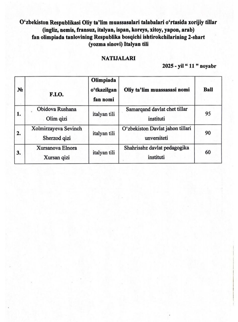 O‘zbekiston Respublikasi oliy ta’lim muassasalari talabalari o‘rtasida xorijiy tillar fan olimpiadasi tanlovining Respublika bosqichi ishtirokchilarining 2-shart (yozma sinovi) italyan tili natijalari