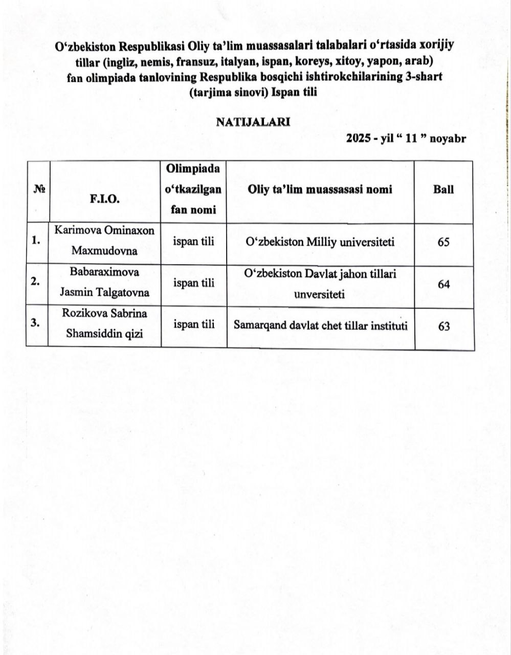 O‘zbekiston Respublikasi oliy ta’lim muassasalari talabalari o‘rtasida xorijiy tillar fan olimpiadasi tanlovining Respublika bosqichi ishtirokchilarining 3-shart (tarjima sinovi) ispan tili natijalari