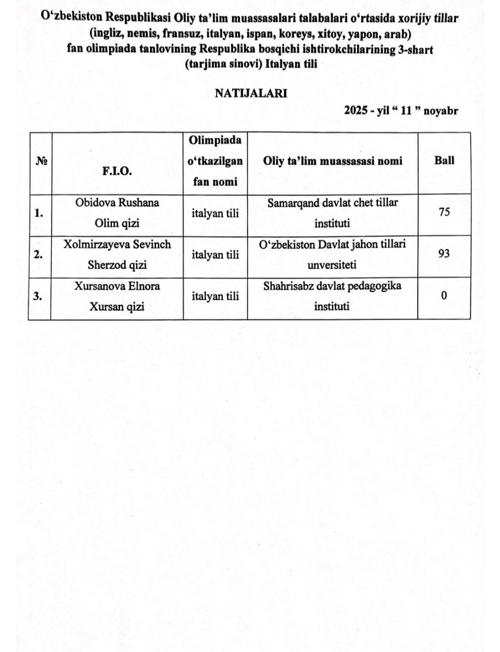O‘zbekiston Respublikasi oliy ta’lim muassasalari talabalari o‘rtasida xorijiy tillar fan olimpiadasi tanlovining Respublika bosqichi ishtirokchilarining 3-shart (tarjima sinovi) italyan tili natijalari