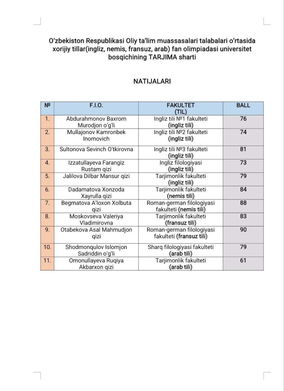 O‘zbekiston Respublikasi Oliy ta’lim muassasalari talabalari o‘rtasida xorijiy tillar(ingliz, nemis, fransuz, arab) fan olimpiadasi universitet bosqichining SUHBAT sharti natijalari