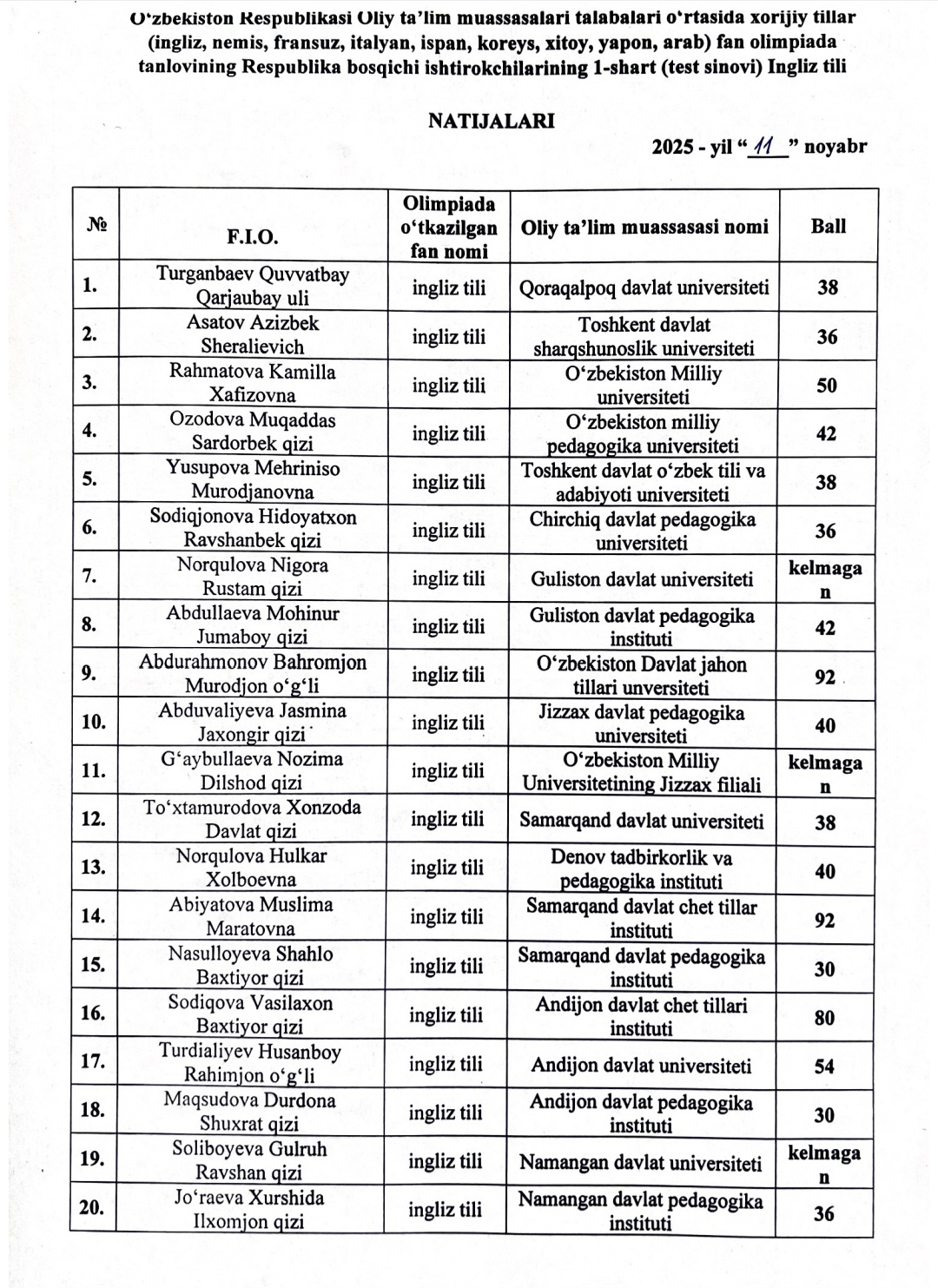 O‘zbekiston Respublikasi Oliy talim muassasalari talabari ortasida xorijiy tillar fan olimpiada tanlovining Respublika bosqichi ishtirokchilarining 1-shart (test sinovi) ingliz tili natijalari
