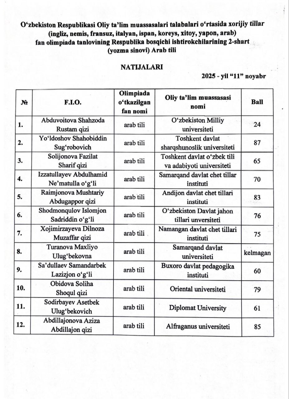 O‘zbekiston Respublikasi Oliy talim muassasalari talabari ortasida xorijiy tillar fan olimpiada tanlovining Respublika bosqichi ishtirokchilarining 2-shart (yozma sinovi) arab tili natijalari