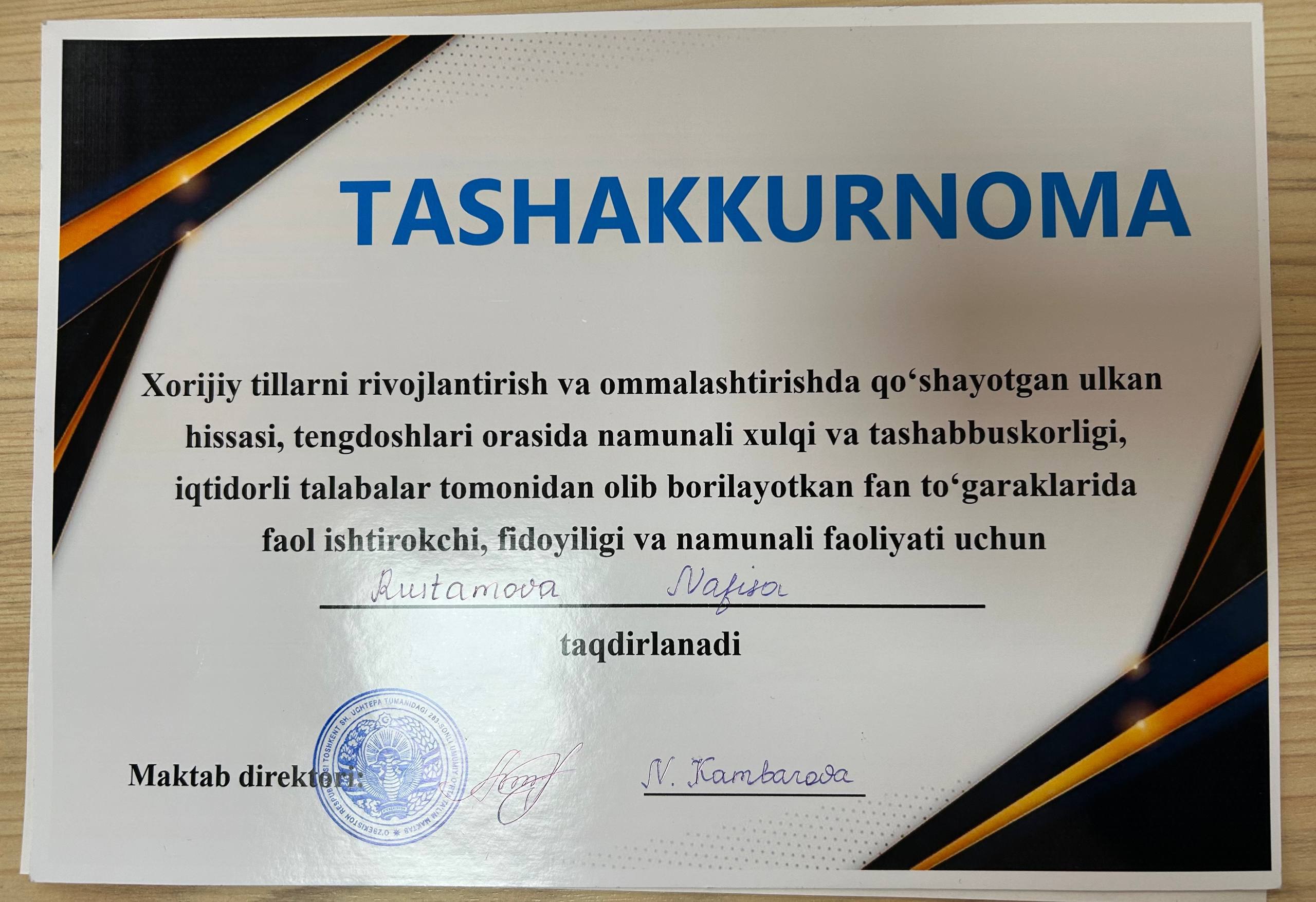 Особое признание было оказано студенткам 4 курса факультета английской филологии Н. Рустамовой и С. Бойназаровой за их активность, ответственность и преданность делу в организации работы кружка.