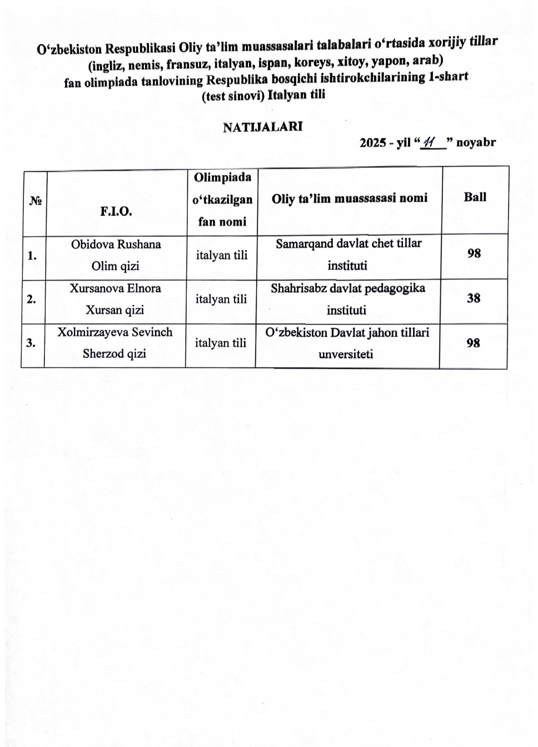 Результаты первого этапа (тестирования) по итальянскому языку участников Республиканского этапа олимпиады по иностранным языкам среди студентов высших учебных заведений Республики Узбекистан
