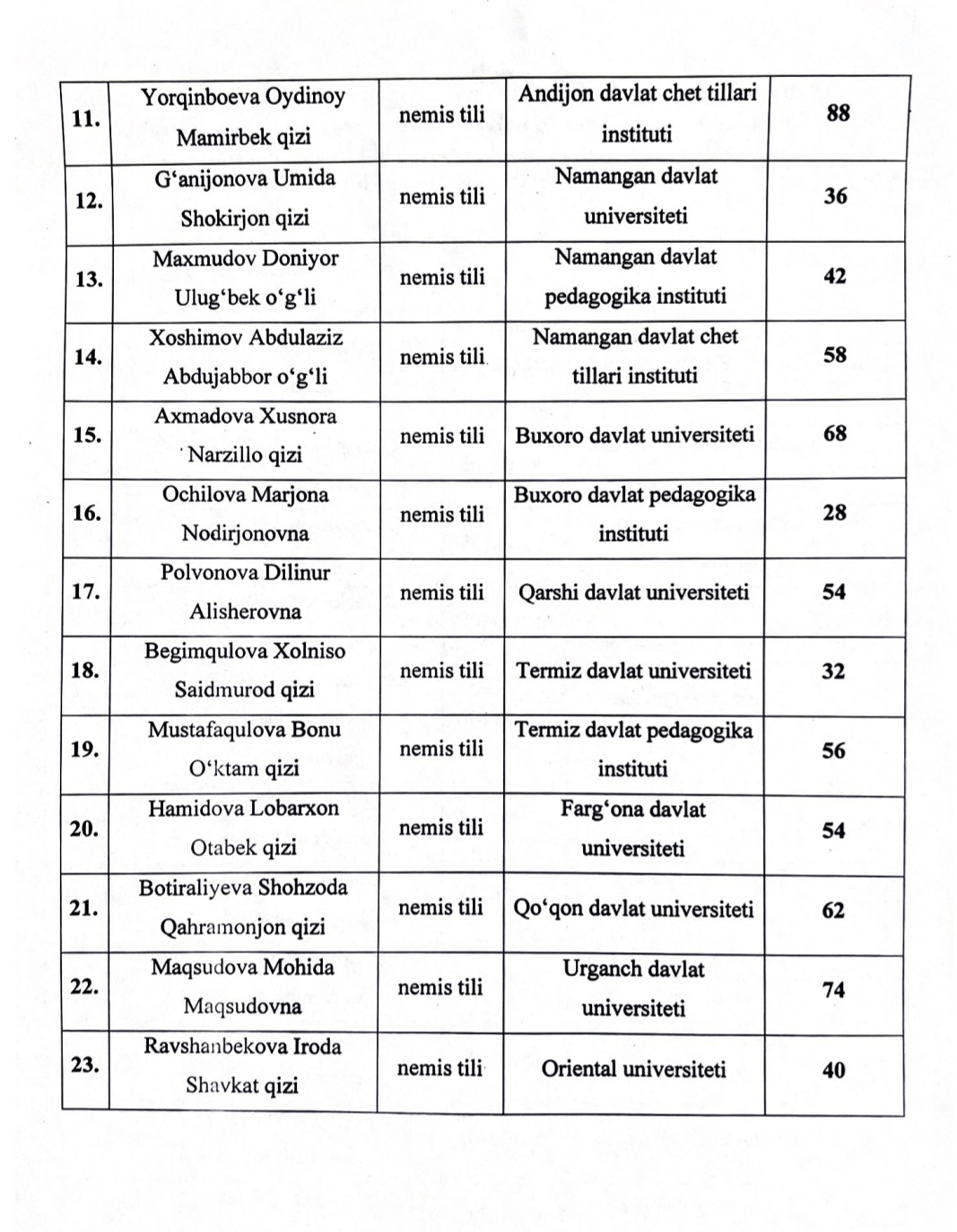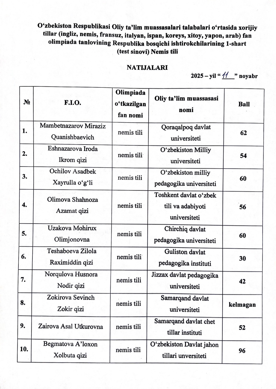 Результаты первого этапа (тестирования) по немецкому языку участников Республиканского этапа олимпиады по иностранным языкам среди студентов высших учебных заведений Республики Узбекистан
