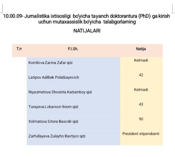Результаты претендентов по специальному экзамену для поступления в базовую докторскую программу (PhD) по специальности 10.00.09 – Журналистика
