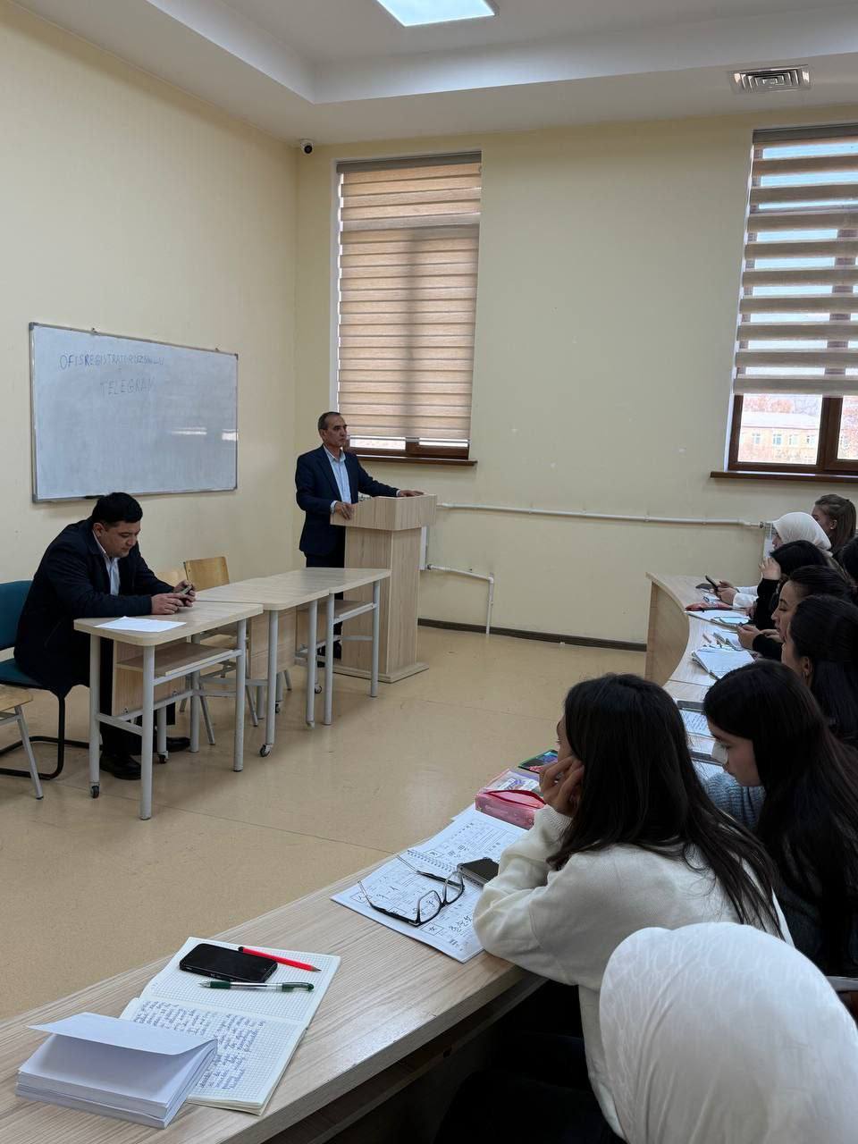 В начале встречи начальник отдела обслуживания Ахмедов Абдулазиз Машрабович выступил с речью и представил информацию об основных задачах и направлениях деятельности Регистраторского офиса. Затем менеджеры подробно разъяснили студентам вопросы, которые они часто встречают в учебном процессе, порядок оформления необходимых документов, способы обращения, а также правила пользования электронными услугами.