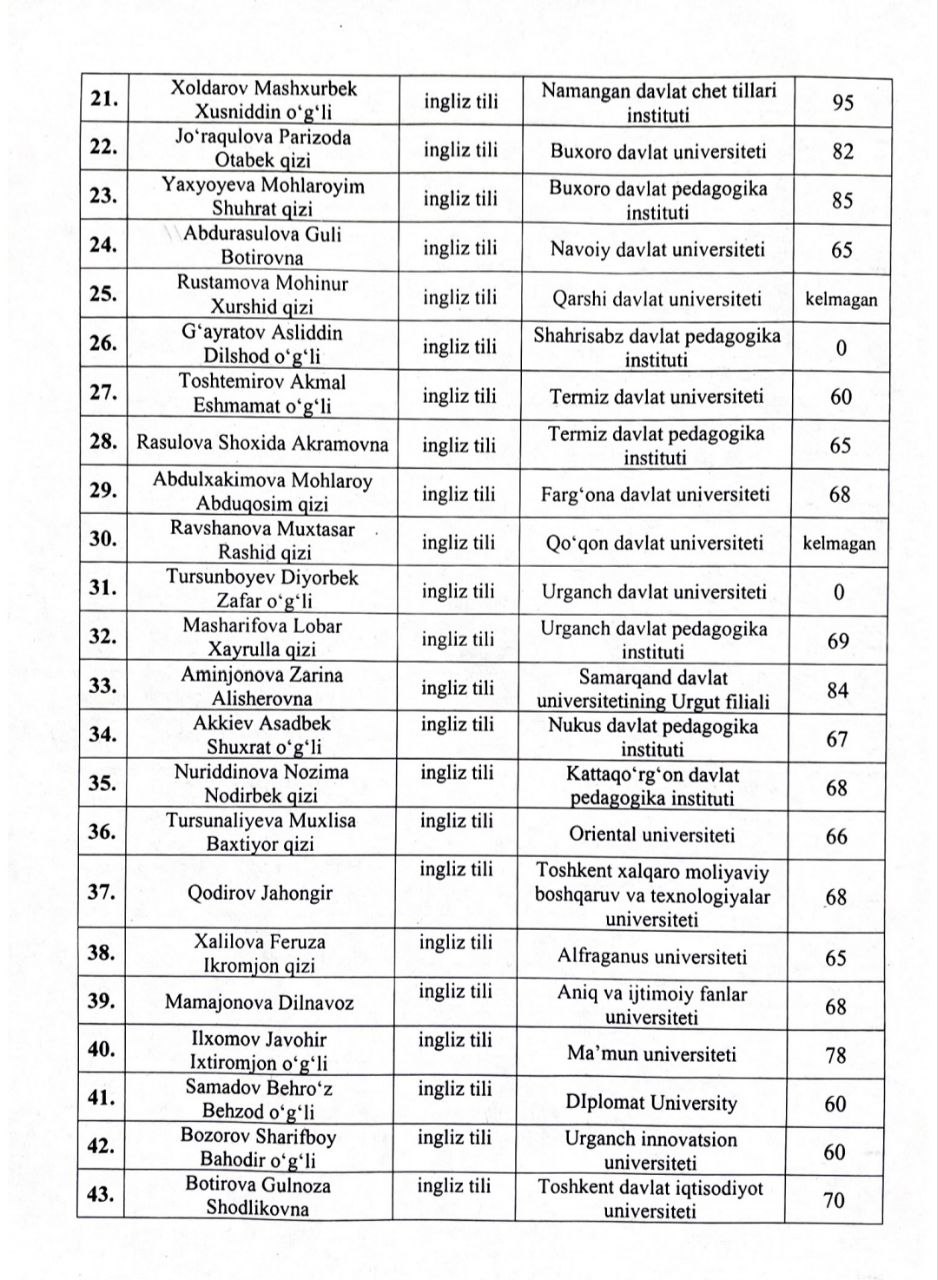 O‘zbekiston Respublikasi oliy ta’lim muassasalari talabalari o‘rtasida xorijiy tillar fan olimpiadasi tanlovining Respublika bosqichi ishtirokchilarining 2-shart (yozma sinovi) ingliz tili natijalari
