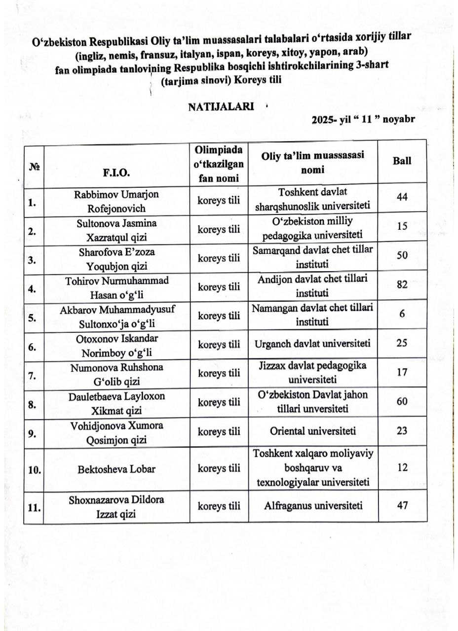 O‘zbekiston Respublikasi oliy ta’lim muassasalari talabalari o‘rtasida xorijiy tillar fan olimpiadasi tanlovining Respublika bosqichi ishtirokchilarining 3-shart (tarjima sinovi) koreys tili natijalari