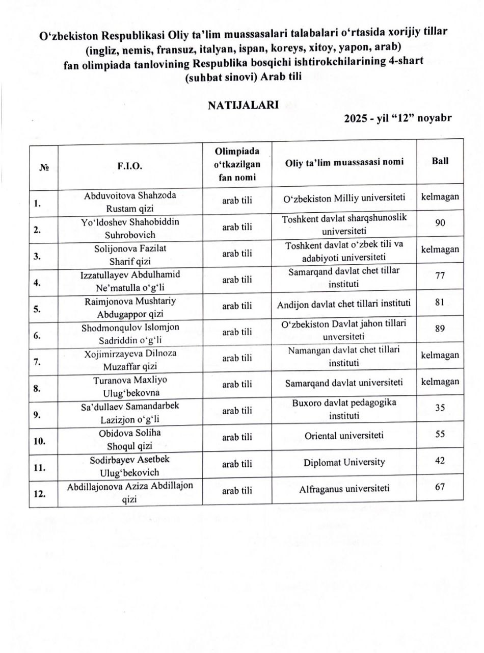 O‘zbekiston Respublikasi oliy ta’lim muassasalari talabalari o‘rtasida xorijiy tillar fan olimpiadasi tanlovining Respublika bosqichi ishtirokchilarining 4-shart (suhbat sinovi) arab tili natijalari