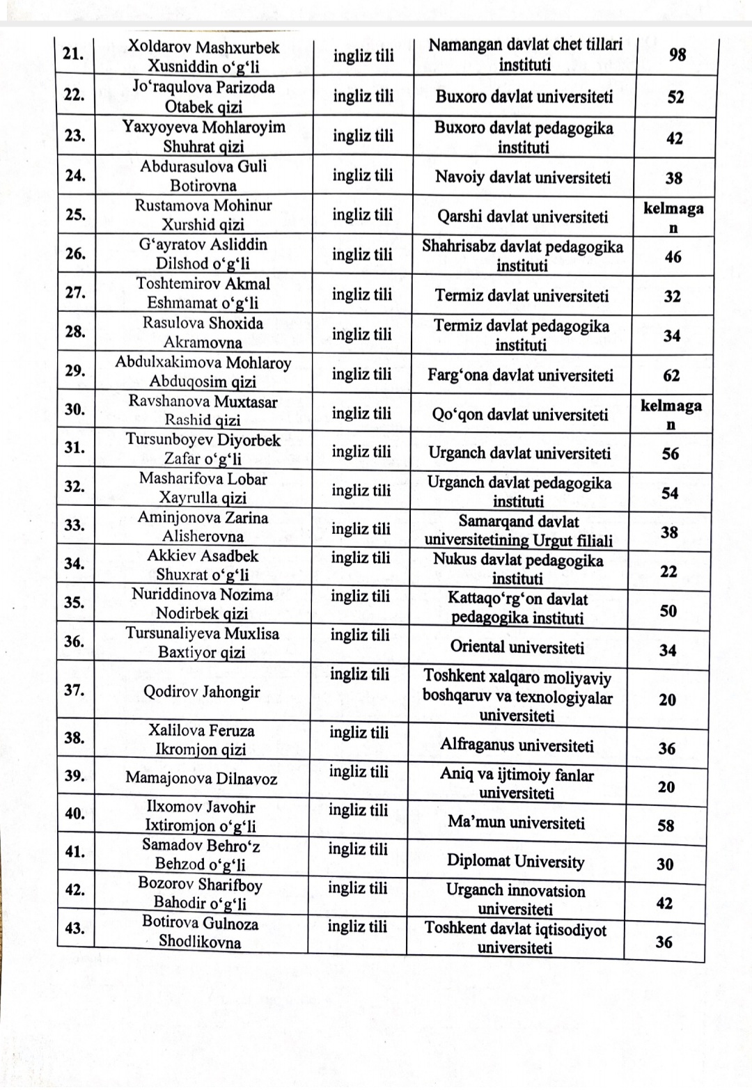 O‘zbekiston Respublikasi Oliy talim muassasalari talabari ortasida xorijiy tillar fan olimpiada tanlovining Respublika bosqichi ishtirokchilarining 1-shart (test sinovi) ingliz tili natijalari