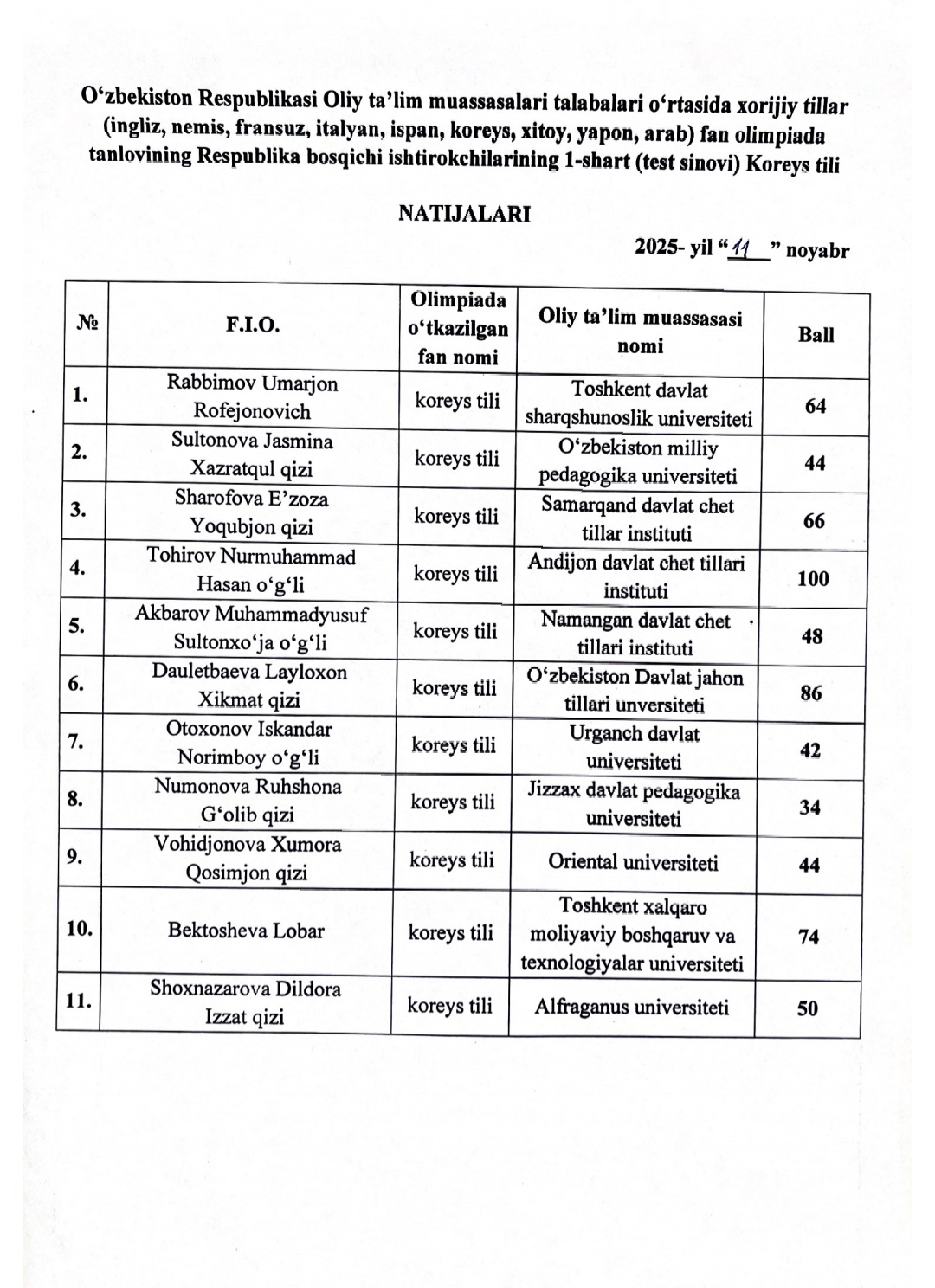 O‘zbekiston Respublikasi Oliy talim muassasalari talabari ortasida xorijiy tillar fan olimpiada tanlovining Respublika bosqichi ishtirokchilarining 1-shart (test sinovi) koreys tili natijalari